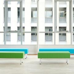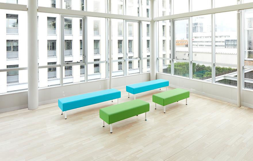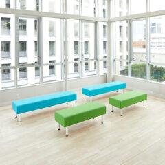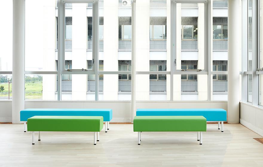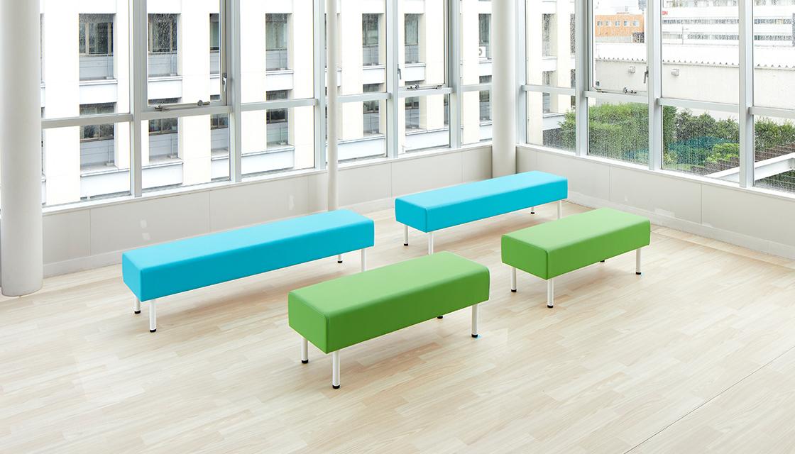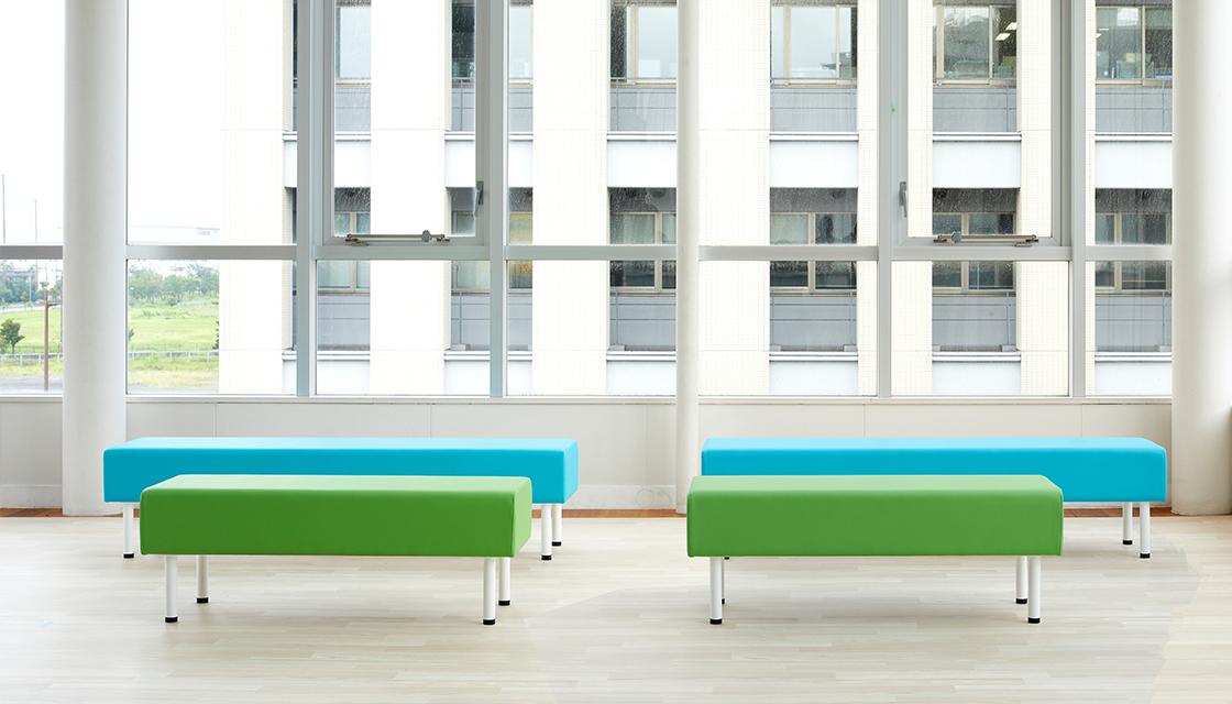 無駄をそぎ落としたフラットなフォルムは、エントランスや待合スペースなど幅広いシーンで活躍。背もたれのないデザインにより、空間を圧迫せず、レイアウトの自由度を高めます。