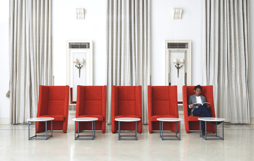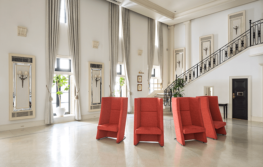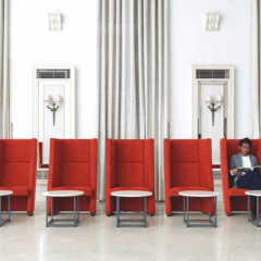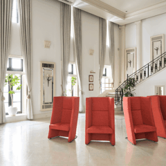 オフィスパーソナルチェアとして設計された、頭から足元まで包み込むハイバック仕様のロビーチェア。図書館やオフィス、ワーキングポッドなどに設置することで、落ち着いたプライベート空間を生み出します。